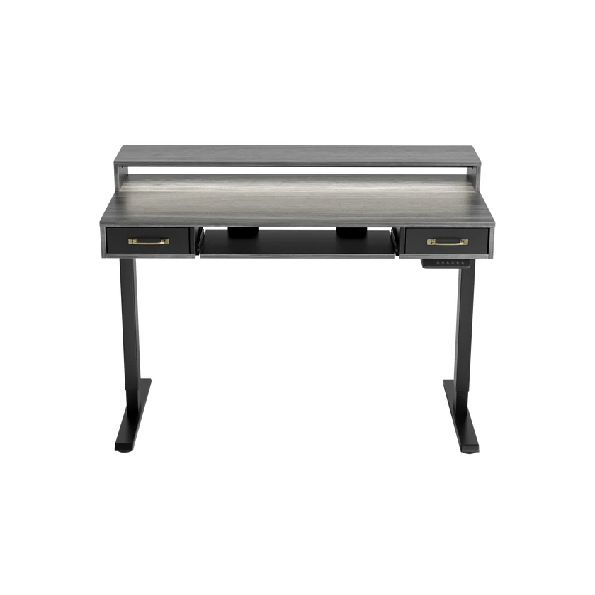 The Evoke Pro Cypher combines a sleek modern design with functional LED technology. Equipped with two spacious lower drawers and a full-width monitor stand, this desk ensures maximum organization and productivity. Available desktop finishes: Rustic Brown and Rustic Grey, with a sturdy black alloy steel frame for stability and durability. Perfect for modern tech setups and professional workspaces.
